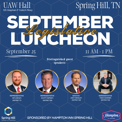 Name: 2025 September State Legislative LuncheonDate: September 25, 2025Time: 11:00 AM - 1:00 PM CDTRegistration: Sorry, public registration for this event has been closed.Event Description:The Spring Hill Chamber of Commerce invites you to the September State Legislative Luncheon on Thursday, September 25, 2025, from 11:00 AM to 1:00 PM at the UAW Hall in Spring Hill.