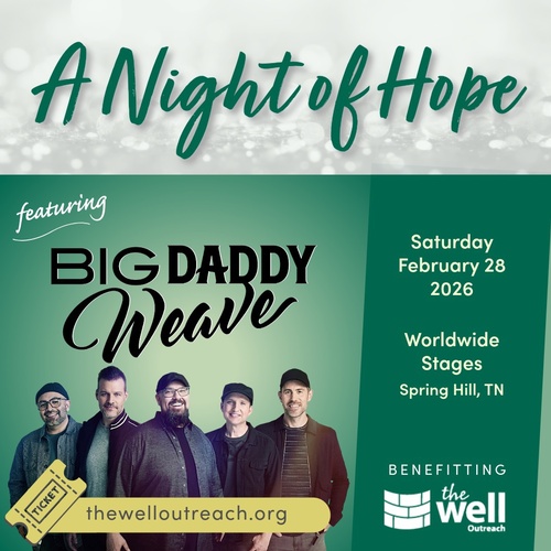 Name: 2026 Night of Hope featuring Big Daddy Weave benefitting The Well OutreachDate: February 28, 2026Time: 6:00 PM - 10:00 PM CSTWebsite: Click here to learn more!Event Description:The Well Outreach will host 2026 A Night of Hope featuring Big Daddy Weave to benefit The Well. Click here for more information!