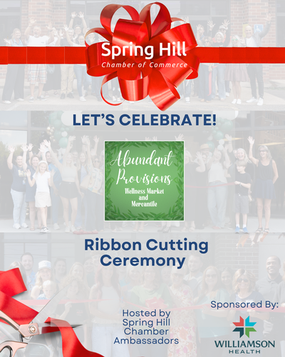 Name: Abundant Provisions Wellness Market and Mercantile TN Ribbon Cutting CeremonyDate: January 19, 2026Time: 12:00 PM - 1:00 PM CSTRegistration: Register NowEvent Description:Join us as we celebrate the grand opening of Abundant Provisions Wellness Market and Mercantile, a unique vendor-based market featuring over 70 local vendors specializing in products ranging from body care to market items and so much more.