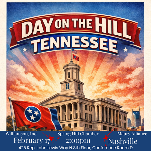 Earlier in the afternoon, attendees will join Williamson, Inc., Maury Alliance, and the Spring Hill Chamber of Commerce at Cordell Hull to hear directly from legislators and gain insight into priorities shaping the 2026 legislative session (2:00–4:00 PM).