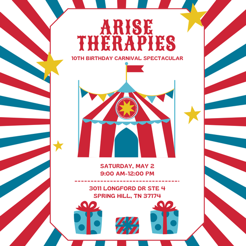 Name: Arise Therapies 10th Birthday Carnival SpectacularDate: May 2, 2026Time: 9:00 AM - 12:00 PM CDTWebsite: Click here for more information!Event Description:Arise Therapies will host their 10th Birthday Carnival Spectacular! Click here for more information!