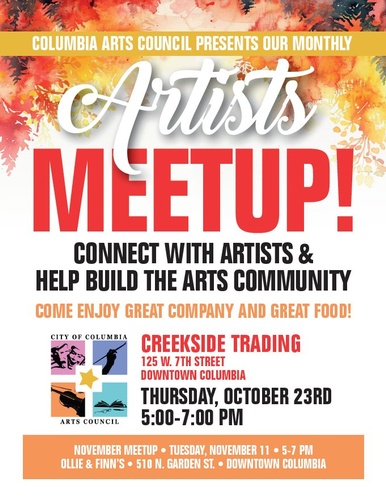 Name: Artists MeetupDate: October 23, 2025Time: 5:00 PM - 7:00 PM CDTWebsite: Click here for more information!Event Description:Columbia Arts Council will present their monthly Artists Meetup at Creekside Trading at 125 W. 7th Street in Columbia on Thursday October 23 from 5pm-7pm. Click here for more information!