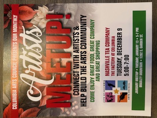 Name: Artists Meetup!Date: December 9, 2025Time: 5:00 PM - 7:00 PM CSTWebsite: Click here for more information!Event Description:Columbia Arts Council will host their monthly Artists Meetup on Tuesday, December 9, from 5pm-9pm at the Nashville Tea Company, located inside the Factory at Columbia at 101 N. James Campbell Blvd., Columbia. Click here for more information!