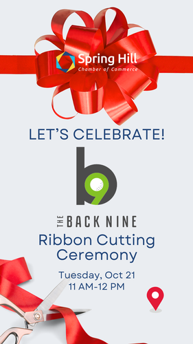 The Spring Hill Chamber invites you to a ribbon cutting ceremony celebrating Back Nine Golf on Tuesday, October 21, 2025, from 11:00 AM to 12:00 PM.