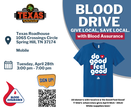 Name: Blood Assurance Blood DriveDate: April 28, 2026Time: 3:00 PM - 7:00 PM CDTWebsite: Click here to learn more!Event Description:Blood Assurance will hold a Blood Drive in Spring Hill. Click here for more information!