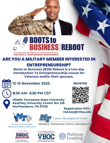 Location: Middle Tennessee State University, Keathley University Center, Room 318, Murfreesboro, TNParticipants will learn how to develop a business concept, build a business plan, and explore SBA resources designed to help launch and grow small businesses.