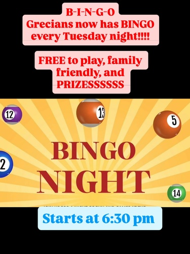 Name: BrainBlast Bingo at GrecianDate: July 10, 2029Time: 6:30 PM - 7:30 PM CDTWebsite: Click here to learn more!Event Description:Grecian Family Restaurant and Bakery hosts BrainBlast Bingo every Tuesday at their location. Click here for more information!