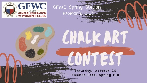 Name: Chalk Art Contest by GFWC Spring Station Woman's ClubDate: October 25, 2025Time: 8:00 AM - 2:00 PM CDTWebsite: Click here for more information!Event Description:GFWC Spring Station Woman's Club will hold a Chalk Art Contest at Fischer Park at 4285 Port Royal Road in Spring Hill on Saturday October 25. Check in is from 8am-9pm and working time will be from 8am-2pm, with winners being announced between 2:30pm and 3pm. Click here for more information!