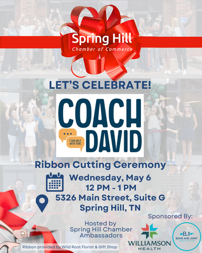 Name: Coach David Ribbon Cutting CeremonyDate: May 6, 2026Time: 12:00 PM - 1:00 PM CDTRegistration: Register NowEvent Description:The Spring Hill Chamber is excited to celebrate Coach David with an official ribbon cutting!