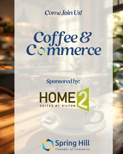 Name: Coffee & Commerce: HOME2 SUITES TRU BY HILTON SPRING HILLDate: January 8, 2026Time: 8:30 AM - 9:30 AM CSTRegistration: Register NowEvent Description:Connect with us for Coffee & Commerce, our monthly morning networking event designed to help local business professionals build relationships, exchange ideas, and stay connected with the Spring Hill community.