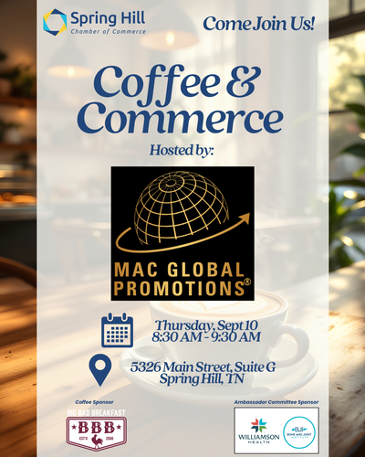 Name: Coffee & Commerce: MAC GLOBAL PROMOTIONSDate: September 10, 2026Time: 8:30 AM - 9:30 AM CDTRegistration: Register NowEvent Description:Connect with us for Coffee & Commerce, our monthly morning networking event designed to help local business professionals build relationships, exchange ideas, and stay connected with the Spring Hill community.