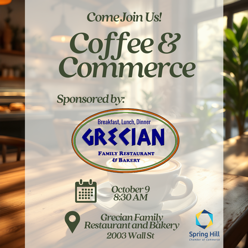 The Spring Hill Chamber of Commerce invites you to the October Commerce & Coffee Mixer on Thursday, October 9, 2025, at 8:30 AM, hosted by Grecian Family Restaurant & Bakery! Please join us at 2003 Wall Street in Spring Hill.