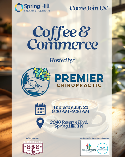 Name: Coffee & Commerce: PREMIER CHIROPRACTICDate: July 23, 2026Time: 8:30 AM - 9:30 AM CDTRegistration: Register NowEvent Description:Connect with us for Coffee & Commerce, our monthly morning networking event designed to help local business professionals build relationships, exchange ideas, and stay connected with the Spring Hill community.