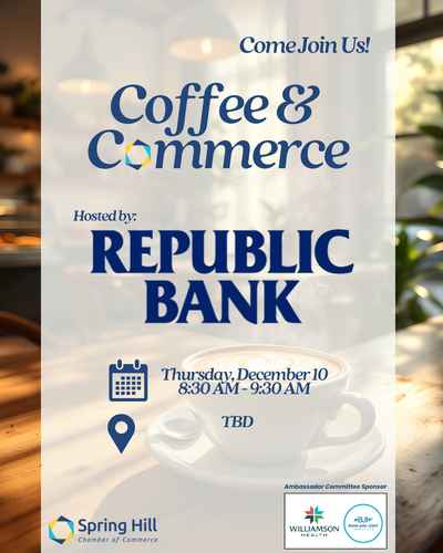 Name: Coffee & Commerce: REPUBLIC BANKDate: December 10, 2026Time: 8:30 AM - 9:30 AM CSTRegistration: Register NowEvent Description:Connect with us for Coffee & Commerce, our monthly morning networking event designed to help local business professionals build relationships, exchange ideas, and stay connected with the Spring Hill community.