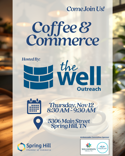 Name: Coffee & Commerce: THE WELL OUTREACH FOOD PANTRYDate: November 12, 2026Time: 8:30 AM - 9:30 AM CSTRegistration: Register NowEvent Description:Connect with us for Coffee & Commerce, our monthly morning networking event designed to help local business professionals build relationships, exchange ideas, and stay connected with the Spring Hill community.