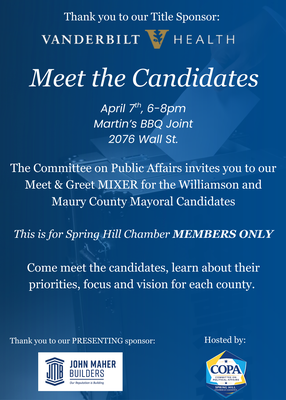 Name: COPA Quarterly Mixer for Chamber Members: Maury & Williamson County Mayoral CandidatesDate: April 7, 2026Time: 6:00 PM - 8:00 PM CDTRegistration: Register NowEvent Description:Our Committee on Political Affairs (COPA) invites you to an evening focused on informed leadership and community connection for our Chamber members.