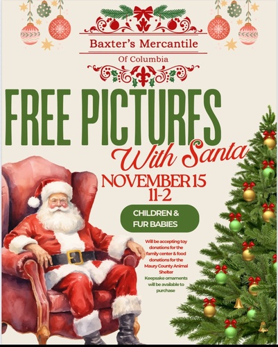 Name: Free Pictures with SantaDate: November 15, 2025Time: 11:00 AM - 2:00 PM CSTWebsite: Click here for more information!Event Description:Baxter's Mercantile of Columbia will host Free Pictures with Santa for Children and Fur Babies on Tuesday, November 15 from 11am-2pm at 808 S. Garden Street in Columbia. Click here for more information!