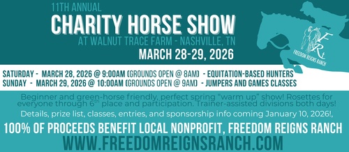 Name: Freedom Reigns Ranch's 11th Annual Charity Horse Show at Walnut Trace Farm - Nashville, TNDate: March 28, 2026 - March 29, 2026Website: Click here to learn more!Event Description:Freedom Reigns Ranch will host their 11th Annual Charity Horse Show at Walnut Trace Farm in Nashville. Click here for more information!