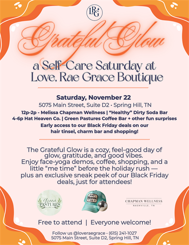 Name: Grateful Glow: A Self-Care Saturday at Love, Rae Grace BoutiqueDate: November 22, 2025Time: 12:00 PM - 6:00 PM CSTWebsite: http://Www.loveraegrace.comEvent Description:Take a little “me time” before the holiday rush at our cozy pre–Black Friday self-care event!