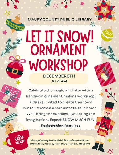 Name: Let it Snow! Ornament WorkshopDate: December 5, 2025Time: 4:00 PM - 6:00 PM CSTWebsite: Click here for more information!Event Description:The Maury County Public Library will host "Let it Snow! Ornament Workshop". Click here for more information!