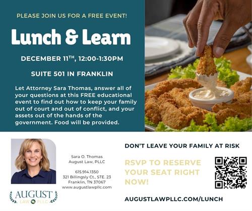 Name: Lunch & Learn - FREE Educational Event!Date: December 11, 2025Time: 12:00 PM - 1:30 PM CSTWebsite: http://augustlawpllc.com/lunchEvent Description:Join us for an engaging Lunch and Learn session dedicated to protecting what matters most: your assets, your family, and your future. Estate planning can often feel overwhelming, but it doesn't have to be. In this relaxed, educational environment, we will break down complex legal concepts into clear, actionable steps—all while you enjoy a complimentary meal.