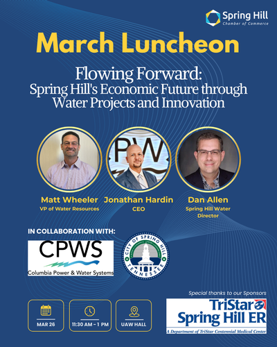 Name: March Luncheon - Flowing Forward: Spring Hill's Economic Future through Water Projects and InnovationDate: March 26, 2026Time: 11:30 AM - 1:00 PM CDTRegistration: Register NowEvent Description:Flowing Forward: Spring Hill’s Economic Future through Water Projects and Innovation