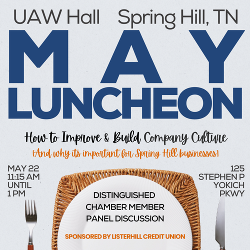 Name: May 2025 Monthly Luncheon: How to Improve & Build Company CultureDate: May 22, 2025Time: 11:15 AM - 1:00 PM CDTRegistration: Sorry, public registration for this event has been closed.Event Description:Join us for the May 2025 Monthly Luncheon on Thursday, May 22, 2025, from 11:15 AM - 1:00 PM at the UAW Hall in Spring Hill.