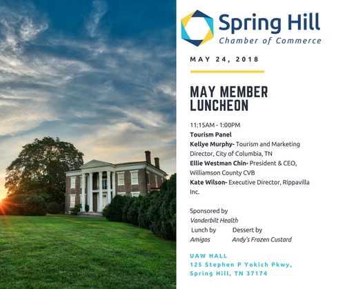 Name: May Member Luncheon 2018Date: May 24, 2018Registration: Sorry, public registration for this event has been closed.Event Description:Join the Spring Hill Chamber of Commerce and members for networking and an education program.