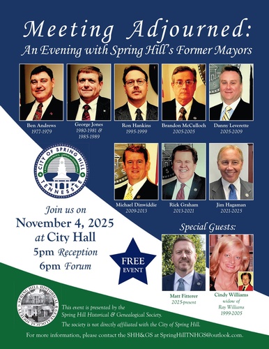 Name: Meeting Adjourned: An Evening with Spring Hill's Former MayorsDate: November 4, 2025Time: 5:00 PM - 8:00 PM CSTWebsite: Click here for more information!Event Description:Spring Hill Historical & Genealogical Society will be hosting "Meeting Adjourned: An Evening with Spring Hill's Former Mayors", on Tuesday, November 4, 2025 at Spring Hill City Hall at 199 Town Center Pkwy. Reception begins at 5pm, Forum begins at 6pm. Click here for more information!