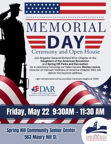 Name: Memorial Day Ceremony and Open HouseDate: May 22, 2026Time: 9:30 AM - 11:30 AM CDTWebsite: Click here for more information!Event Description:Join Brigadier General Richard Winn Chapter of the Daughters of the American Revolution and Spring Hill Parks and Recreation for a ceremony honoring our fallen heroes. Click here for more information!
