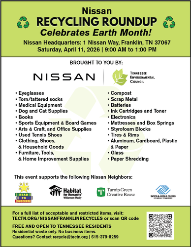 Name: Nissan Recycling Roundup 2026Date: April 11, 2026Time: 9:00 AM - 1:00 PM CDTWebsite: Click here to learn more!Event Description:Nissan Headquarters and the Tennessee Environmental Council will host Recycling Roundup to celebrate Earth Month. Click here for more information!