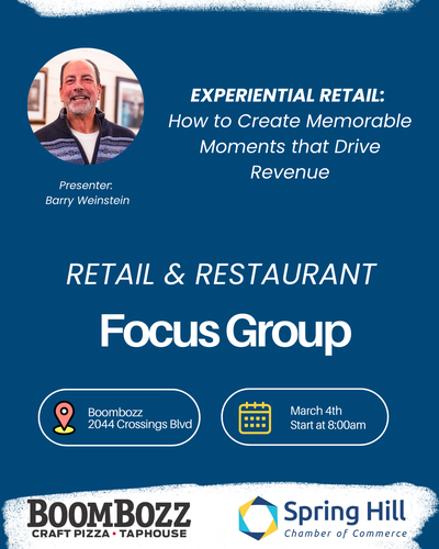 Name: Retail + Restaurant Industries Focus Group MeetingDate: March 4, 2026Time: 8:00 AM - 9:30 AM CSTRegistration: Sorry, public registration for this event has been closed.Event Description:This meeting brings together local business owners and managers to share insights, discuss challenges, celebrate successes, and network with fellow professionals. Our goal is to foster open conversation and gather input that helps us better serve the unique needs of Spring Hill’s retail and restaurant community.