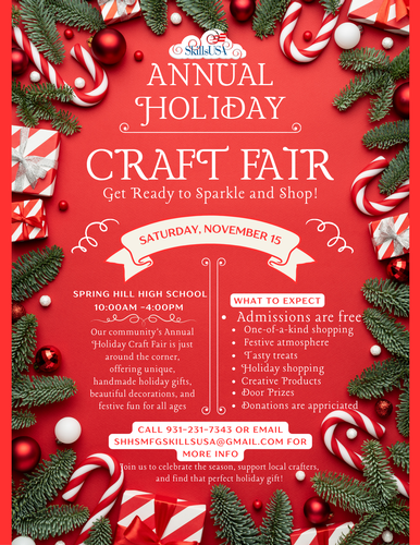 Name: SHHS Skills USA Engineering Kids Annual Holiday Craft FairDate: November 15, 2025Time: 10:00 AM - 4:00 PM CSTWebsite: Click here for more information!Event Description:Spring Hill High School Skills USA Engineering Students are hosting their Annual Holiday Craft Fair at Spring Hill High School, 1 Raider Lane, Columbia, on Saturday, November 15 from 10am-4pm.