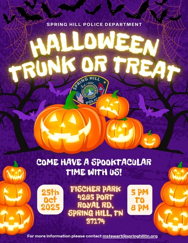 Name: SHPD Trunk or TreatDate: October 25, 2025Time: 5:00 PM - 8:00 PM CDTWebsite: Click here for more information!Event Description:The Spring Hill Police Department will host Trunk or Treat on Saturday, October 25, 2025 from 5pm-8pm at Fischer Park at 4285 Port Royal Road, Spring Hill. Click here for more information!