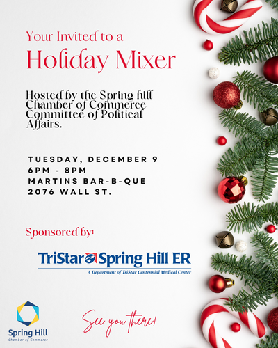 Enjoy a festive evening with hors d'oeuvres, cocktails, and holiday cheer as we connect, build relationships, and celebrate the season with the Spring Hill business community.