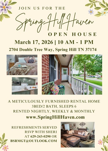 Name: Spring Hill Haven Open HouseDate: March 17, 2026Time: 10:00 AM - 1:00 PM CDTWebsite: Click here to learn more!Event Description:Spring Hill Haven will host an Open House with refreshments. Click here for more information!