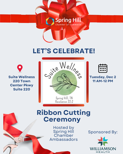 The Spring Hill Chamber invites you to a ribbon cutting ceremony celebrating Suite Wellness on Tuesday, December 2, 2025, from 11 AM to 12 PM.