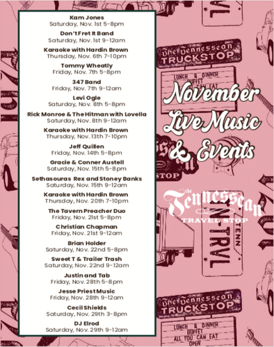 Tennessee Travel Stop is hosting live music through the month of November at 3686 Pulaski Highway in Cornersville. (Off I-65, Exit 22.) Featuring: