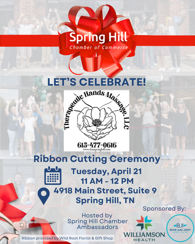 Name: Therapeutic Hands Massage Ribbon Cutting CeremonyDate: April 21, 2026Time: 11:30 AM - 12:30 PM CDTRegistration: Register NowEvent Description:The Spring Hill Chamber is excited to celebrate Therapeutic Hands Massage with an official ribbon cutting in honor of their 1-year anniversary!