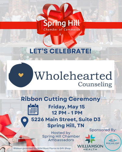 Name: Wholehearted Counseling Ribbon Cutting CeremonyDate: May 15, 2026Time: 12:00 PM - 1:00 PM CDTRegistration: Register NowEvent Description:The Spring Hill Chamber is excited to celebrate Wholehearted Counseling with an official ribbon cutting!