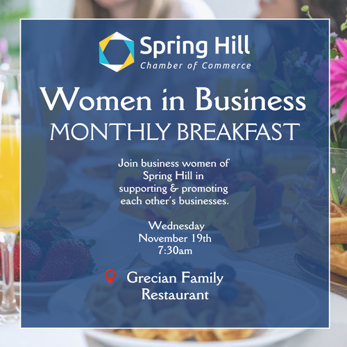 Name: Women in Business BreakfastDate: November 19, 2025Time: 7:30 AM - 9:00 AM CSTEvent Description:Join the Spring Hill Chamber for our Women in Business monthly meeting on Wednesday, November 19, 2025, from 7:30 AM - 9:00 AM at Grecian Family Restaurant, 2003 Wall Street Spring Hill, TN 37174. Please RSVP if you can make it! The group meets monthly on the third Wednesday at Grecian Family Restaurant.