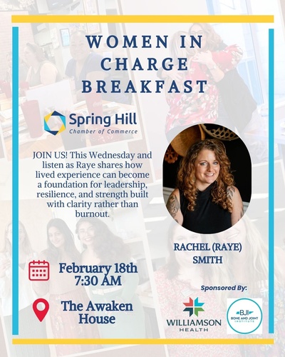 Name: Women In Charge BreakfastDate: February 18, 2026Time: 7:30 AM - 9:00 AM CSTRegistration: Sorry, public registration for this event has been closed.Event Description:JOIN US! This Wednesday and listen as Raye shares how lived experience can become a foundation for leadership, resilience, and strength built with clarity rather than burnout.