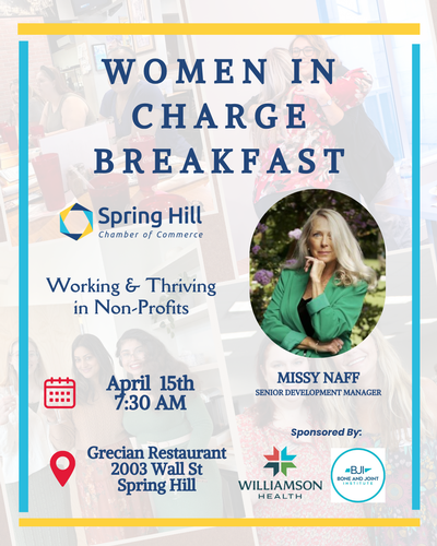 Name: Women In Charge BreakfastDate: April 15, 2026Time: 7:30 AM - 9:00 PM CDTRegistration: Register NowEvent Description:Held every 3rd Wednesday, the Women in Charge Breakfast invites women from all walks of leadership—at home, in business, and in the community—to come together for connection and growth. Enjoy a welcoming environment where women can share experiences, gain insight, and support one another.