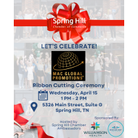 The Spring Hill Chamber invites you to a ribbon cutting ceremony celebrating MAC Global Promotions on Wednesday, April 15, 2026, from 1 PM to 2 PM. MAC Global Promotions® is a boutique promotional marketing firm that helps businesses strengthen their brand through intentional, high quality branded merchandise and strategic marketing support. They partner with corporations, nonprofits, and growth focused organizations to create meaningful brand experiences that leave a lasting impression. From concept to execution, they protect brand integrity and simplify the process.