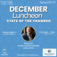 The Spring Hill Chamber of Commerce invites you to the 2025 December State of the Chamber Luncheon on Thursday, December 4, 2025, from 11:15 AM to 1:00 PM at the UAW Hall in Spring Hill.